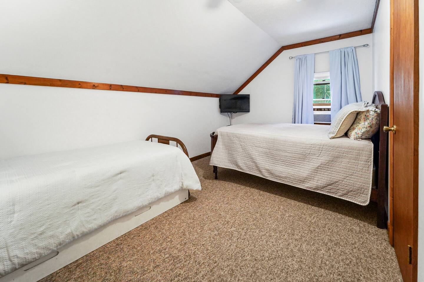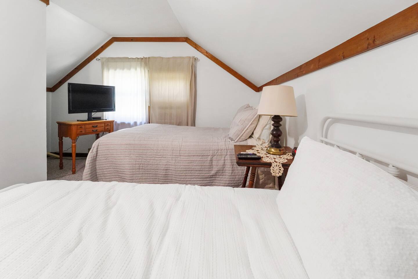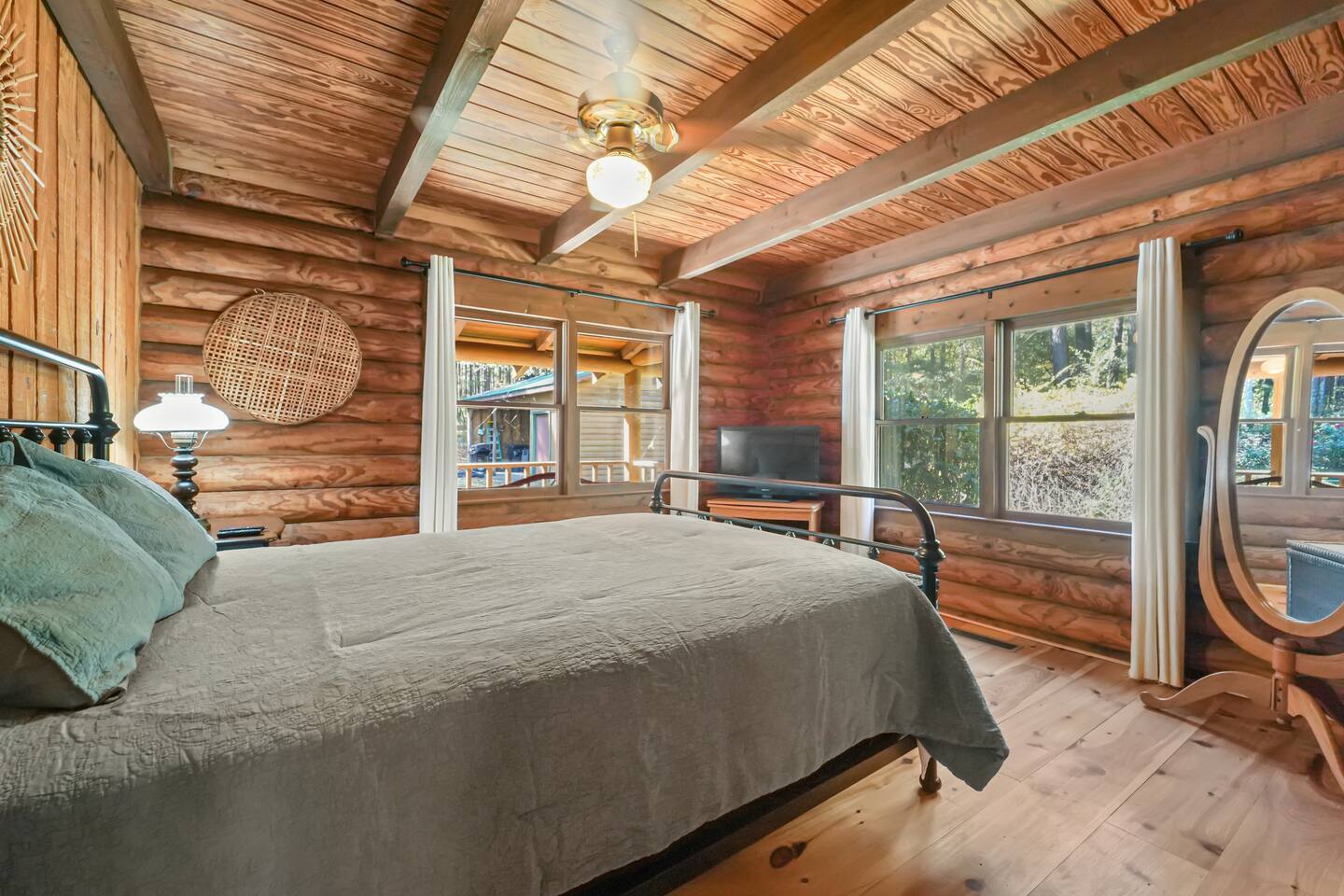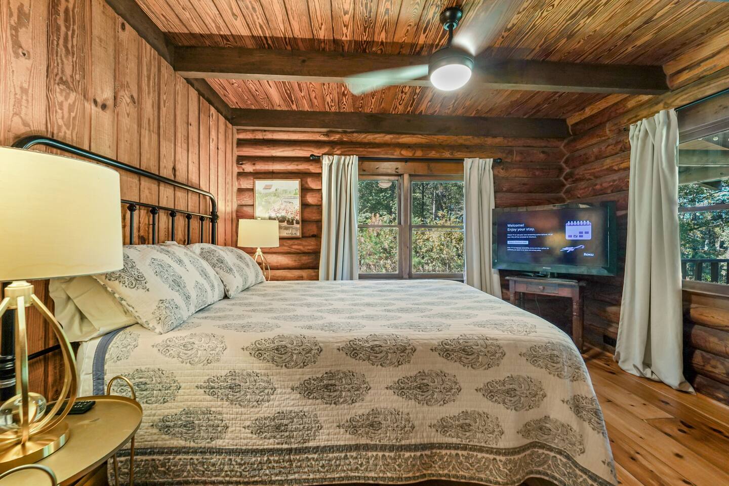 Our cabin has four bedrooms and two full bathrooms. Every bedroom has a television capable of streaming your favorite shows. Two bedrooms are located on the first floor and two are on the second floor. The two bathrooms are located on the first floor.