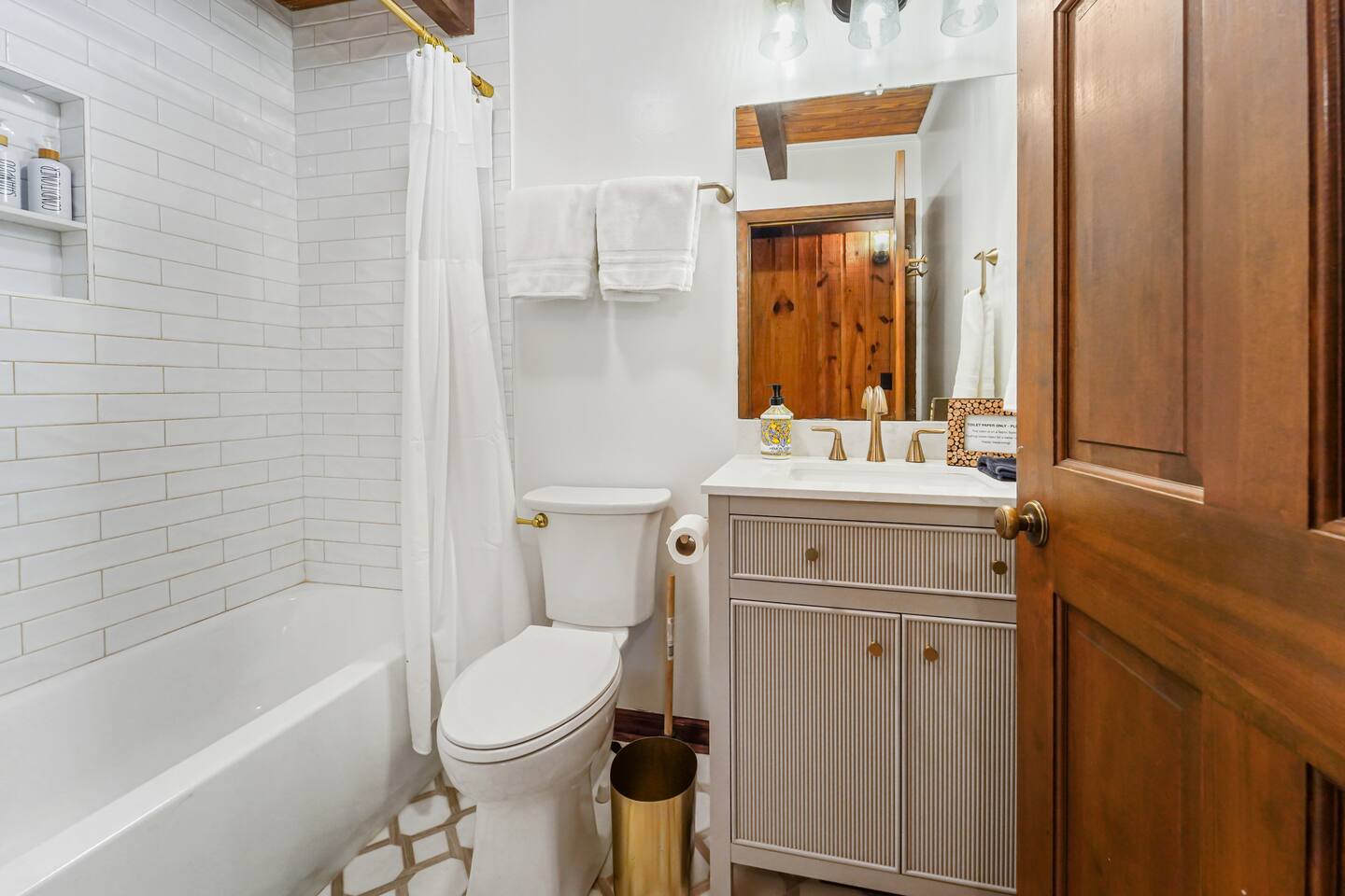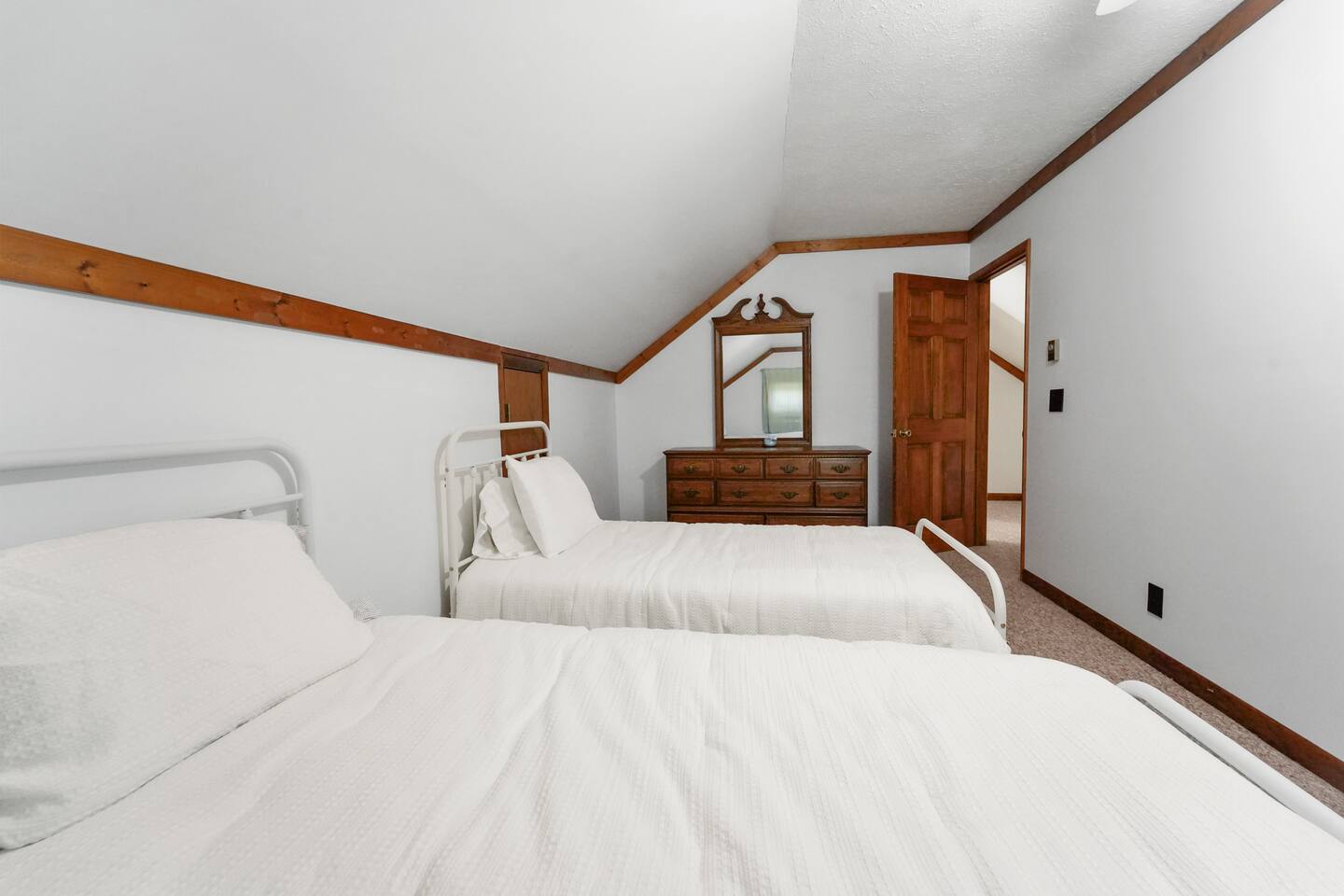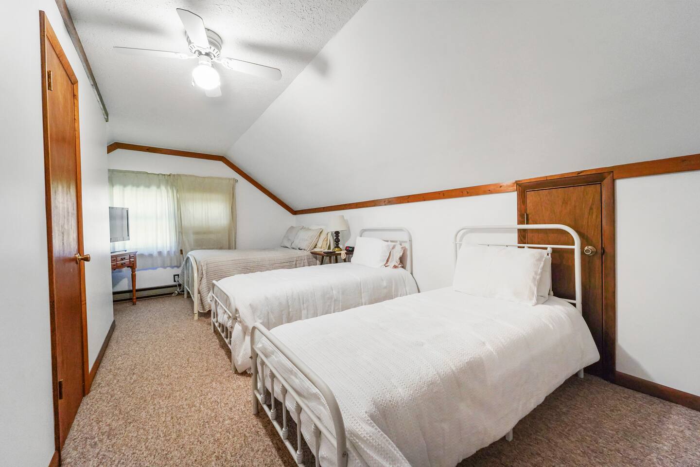 Our cabin has four bedrooms and two full bathrooms. Every bedroom has a television capable of streaming your favorite shows. Two bedrooms are located on the first floor and two are on the second floor. The two bathrooms are located on the first floor.