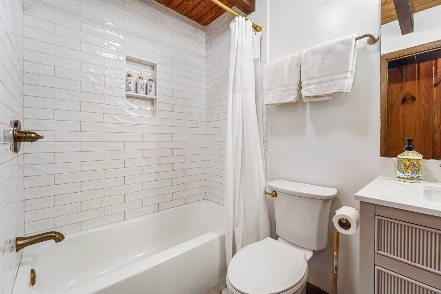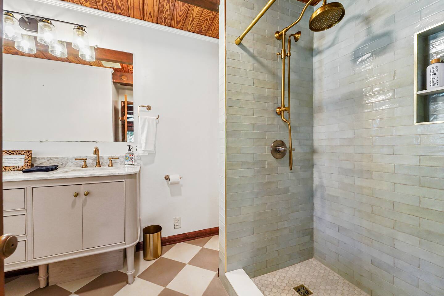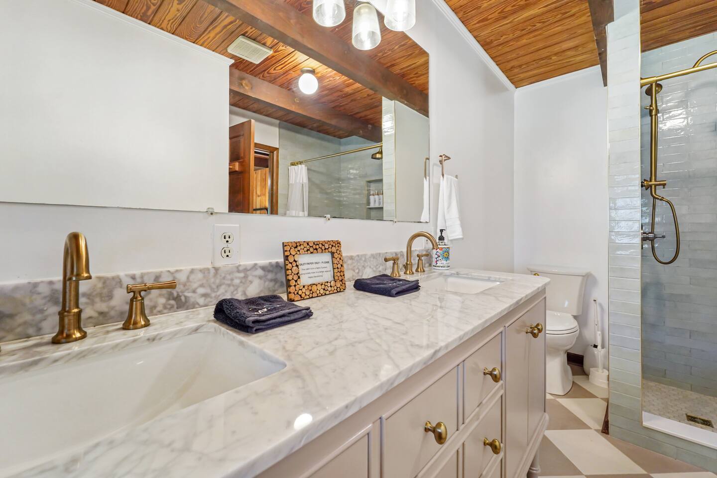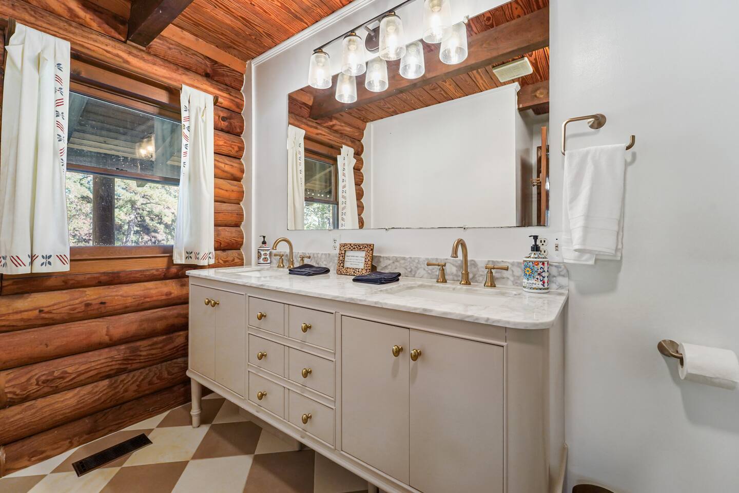 Our cabin has four bedrooms and two full bathrooms. Every bedroom has a television capable of streaming your favorite shows. Two bedrooms are located on the first floor and two are on the second floor. The two bathrooms are located on the first floor.
